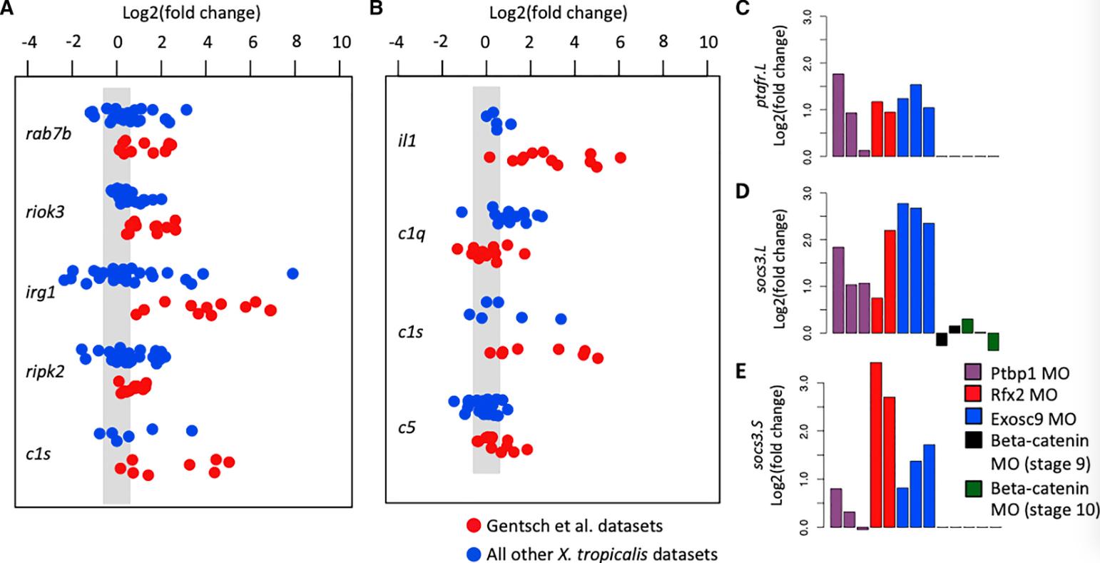 (C and D) Fold-change induction of innate immune response genes in X. tropicalis (C) and X. laevis (D) datasets.