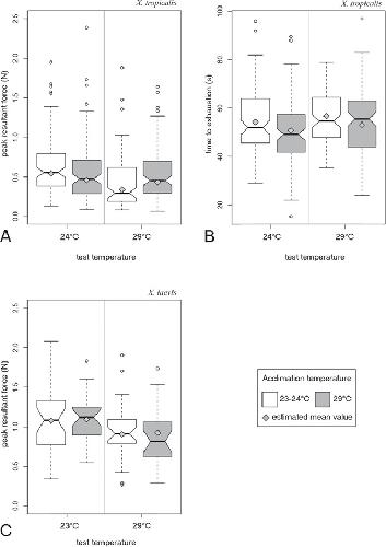 Figure 1. Effects of acclimation temperature and test temperature on the locomotor performance of two frog species. (A) Jumping performance measured as the peak resultant jump force in X. tropicalis (Naccl.24°C test24°C: 101; Naccl. 29°C test 24°C: 98; Naccl. 24°C test 29°C: 99; Naccl. 29°C test 29°C: 102). For jump force, the interaction between acclimation and test temperature was significant. (B) Exertion capacity measured as the time jumped until exhaustion in adult X. tropicalis (Naccl.24°C test24°C: 102; Naccl. 29°C test 24°C: 103; Naccl. 24°C test 29°C: 102; Naccl. 29°C test 29°C: 102), acclimation and test temperature had significant but independent effects. (C) Jumping performance in X. laevis (Naccl.24°C test24°C: 31; Naccl. 29°C test 24°C: 27; Naccl. 24°C test 29°C: 31; Naccl. 29°C test 29°C: 26) showing only an effect of test temperature. Notches illustrate the confidence intervals around the median. Values indicated by the grey diamonds are the estimated mean values from our mixed-effects model.