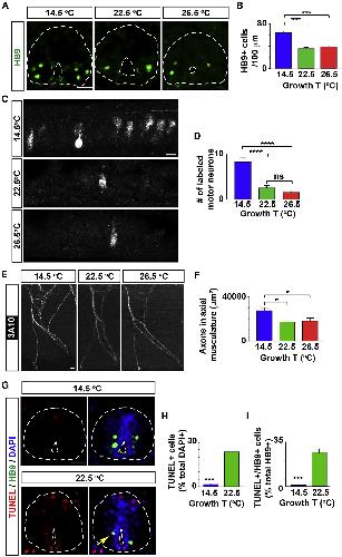 Figure 2. The Number of Spinal Motor Neurons in Developing Larvae Is Temperature Dependent (A) Images show cross-sections of immunostained spinal cord (outlined) from stage 40 larvae grown in cold (14.5°C) or warm (22.5 or 26.5°C) temperatures. (B) Graph shows number of HB9-immunopositive cells per 100 μm of spinal cord; mean ± SEM from at least 220 μm length of spinal cord per larva, n ⥠4 larvae per condition, âââp < 0.001, 1-way ANOVA, Tukey post hoc test. (C) Images show maximum intensity projections of whole-mount spinal cord from stage 40 larvae grown in different temperatures followed by retrograde labeling with Alexa 488-dextran conjugate from ventral axial musculature. (D) Graph shows numbers of retrogradely labeled motor neurons; mean ± SEM for each experimental group, n ⥠10 larvae per condition, ââââp < 0.0001; ns, not significantâ Kruskal-Wallis testâ Dunnâs multiple comparisons test. (E) Images show maximum intensity projections of whole-mount immunostained axonal bundle #5 (with 1 being the most anterior axonal bundle innervating the axial musculature) with the axonal marker 3A10 (neurofilament associated protein), from stage 40 larvae grown in the indicated temperatures. (F) Graph shows area labeled per axonal bundles 4 through 7; mean ± SEM for each experimental group, n ⥠10 larvae per condition, âp < 0.05, 1-way ANOVA, post hoc Tukey test. (GâI) Larvae grown in cold temperature exhibit fewer apoptotic spinal cord cells and motor neurons. (G) Images show cross-sections of immunostained spinal cord (outlined) from stage 40 larvae grown in different temperatures. Scale bars in (A), (C), (E), and (G), 20 μm. (H and I) Graphs show percentage of TUNEL+ (H, per total DAPI-labeled nuclei) and HB9+/TUNEL+ cells (I, per total HB9+ cells) per 100 μm of spinal cord; mean ± SEM from at least 220 μm length of spinal cord per larva, n ⥠4 larvae per condition, âââp < 0.001, two-tailed t test. |