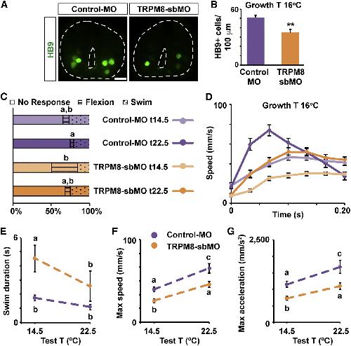 Figure 6. TRPM8 Is Necessary for the Increase in Motor Neuron Number and the Adaptation of the Sensorimotor Response of Animals Grown in Cold Temperatures (A) Images show cross-sections of immunostained spinal cord (outlined) for HB9 from Control-MO- or TRPM8-sbMO-containing stage 40 larvae grown in cold temperature (16°C). Scale bar, 20 μm. (B) Graph shows number of HB9-immunopositive cells per 100 μm of spinal cord; mean ± SEM from at least 220 μm-length spinal cord per larva, n = 5 larvae per condition, ââp < 0.005, two-tailed t test. (CâG) TRPM8-sbMO or Control-MO stage 37/38 (C) and 40 (DâG) larvae grown in cold temperature (16°C) were subjected to 20 trials each of gentle touch at cold (14.5°C) or warm (22.5°C) temperature. Responses were video recorded at 30 Hz, n = 6 larvae per condition. (C) Average percentage of incidence of each response. (D) Time course of changes in speed during initial phase (first 200 ms) of the swim response. (E) Swim duration. (F) Maximum speed during initial phase of the swim response. (G) Maximum tangential acceleration during initial phase of the swim response. In (D)â(G), data are mean ± SEM. In (C) and (E)â(G), the letters on top of datasets indicate significant (different letters) or not significant (same letters) differences, p < 0.05, 2-way ANOVA, Tukey post hoc test. |
