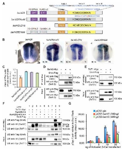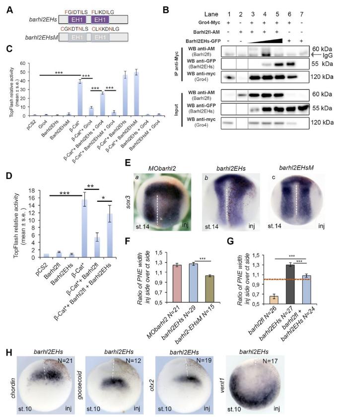 kDa. (C,D) HEK293T cells were transfected with plasmids encoding indicated proteins and Top-Flash activity was assessed (n=3). (E-G) ISH using sox3 as a probe on stage (st)-14 embryos injected with (a) MObarhl2, (b) barhl2EHs or (c) barhl2EHsM. (F) Graph of quantification of E. (G) Graph quantifying the rescue experiment of the dominant-negative barhl2EHs on the barh2fl overexpression phenotype. The red-dotted line indicates a ratio of 1. (H) ISH using indicated probes on st-10 embryos injected with barhl2EHs. A white-dotted line indicates the midline. Inj: injected side.