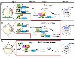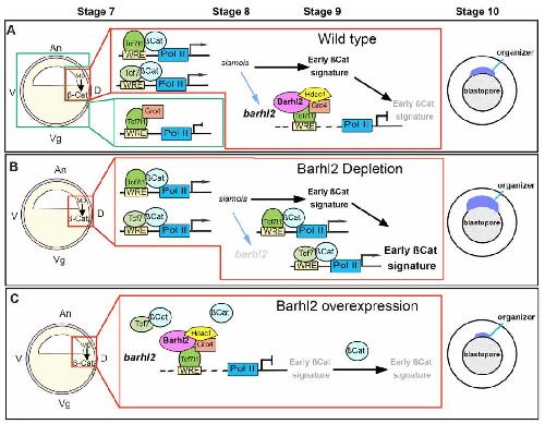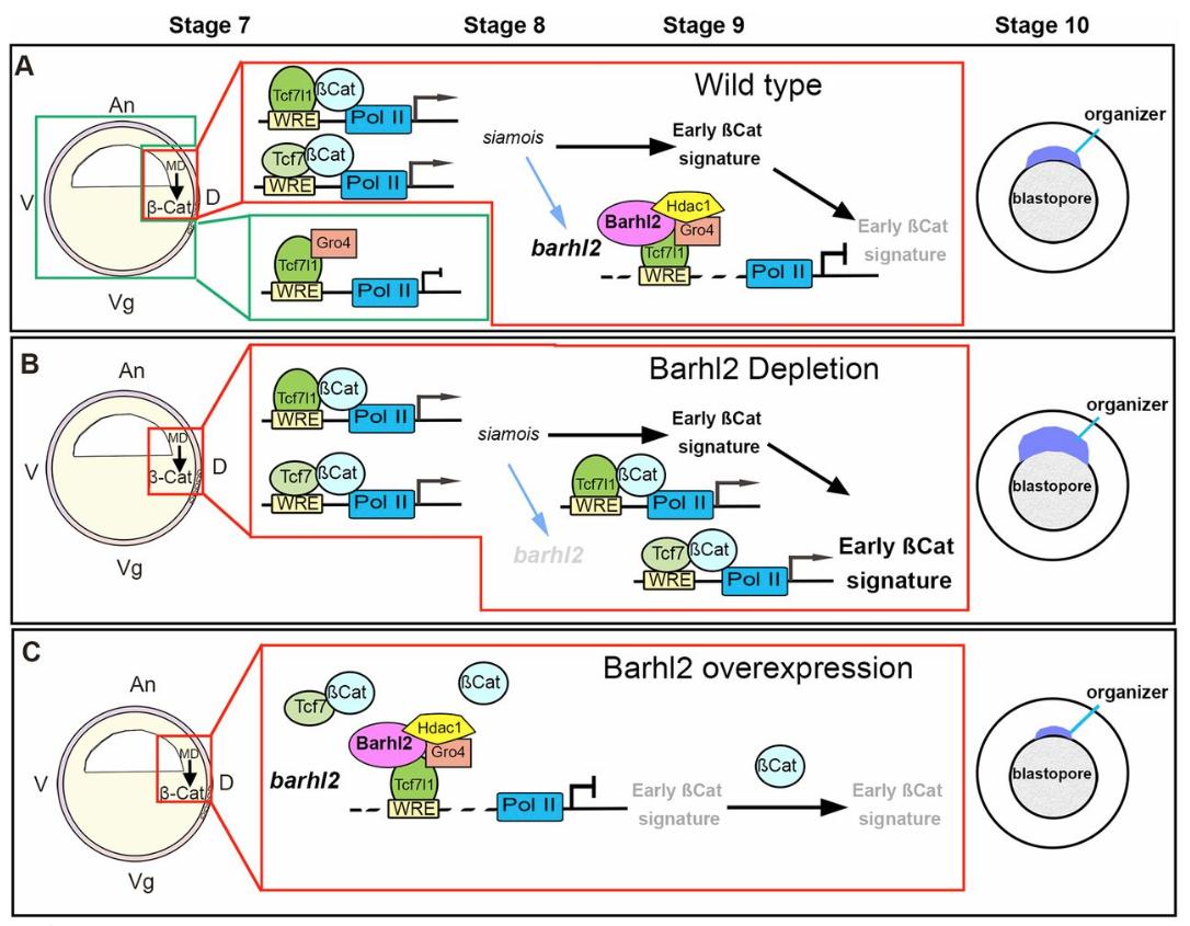 Figure 8. Scheme of results. On the left of each part of the figure is a scheme of a stage-7 embryo. The green rectangle indicates maternally encoded Tcf7l1 with Gro repressing organizer gene transcription throughout the embryo. The red rectangle indicates that, under the influence of maternal determinants (MD), β-Catenin (β-Cat) is stabilized in the presumptive organizer territory. Tcf7l1 bound on WRE is locally derepressed. Tcf7 and/or Tcf7l1 with β-Cat bind to the WRE and induce β-Cat target genes, including siamois. At stage 8, β-Cat and siamois promote induction of the Spemann organizer. siamois on its own probably induces barhl2 expression. Barhl2 holds the Gro4 and Tcf7l1 interaction, and eventually the interaction of Gro4 with Tcf7 and/or other transcription factors. A multipartite protein complex forms with Hdac1, the activity of which switches off the β-Cat response. On the right of each part of the figure is a scheme of a stage-10 embryo. The organizer is shown in blue. (A) The organizer develops within the dorsal blastopore territory. (B) Barhl2 activity is depleted, β-Cat activation is increased, and the organizer territory is enlarged. (C) Barhl2 is overexpressed, β-Cat target genes are either poorly, or not at all, transcribed and the organizer is small or does not develop. An, animal pole; D, dorsal; V, ventral; Vg, vegetal pole.