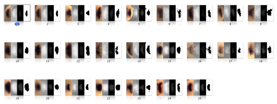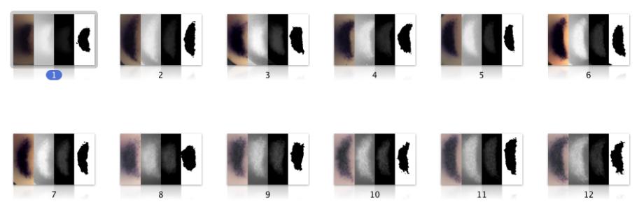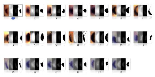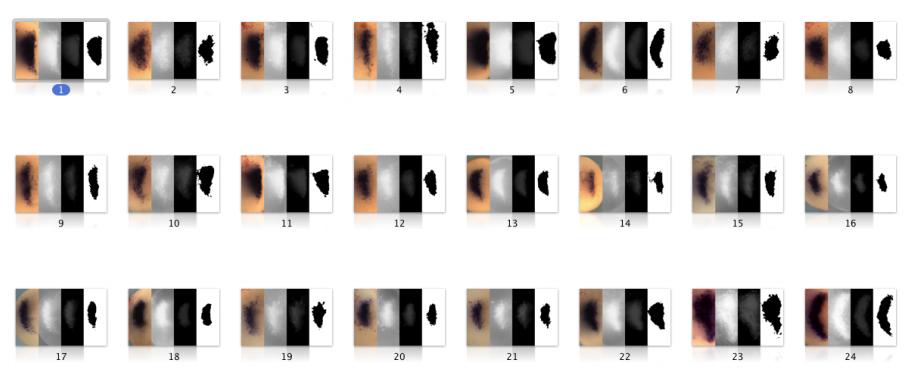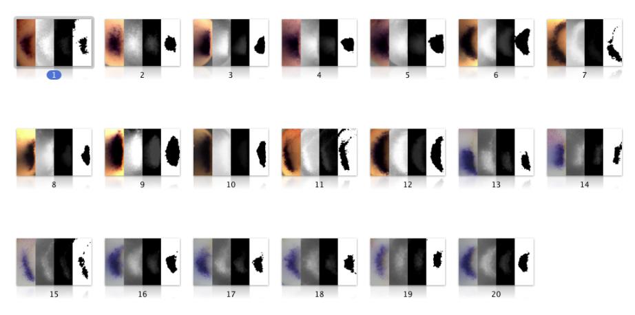 Figure S2: Quantification of Figure 2A chordin staining. The top panel corresponds to the injected side. All analyzed embryos are shown. The control and injected sides were delimited based on tracer. The top panel corresponds to the injected side. For each RGB image every step of the imageJ analysis protocol is shown. From left to right: RGB images centered on the region of interest (ROI) control and injected sides; blue channel of the RGB image; Blue channel minus the background value, estimated as the average intensity of pixels outside the ROI; Area considered for pixels quantification. Pictures correspond to original data after histogram equalization using ImageJ with percentage of saturated pixel 0.4. (A) embryos injected with barhl2fl. (B) embryos injected with MObarhl2-ct. (C) embryos injected with MObarhl2. Figure S2A: Embryos injected with Xbarhl2fl.