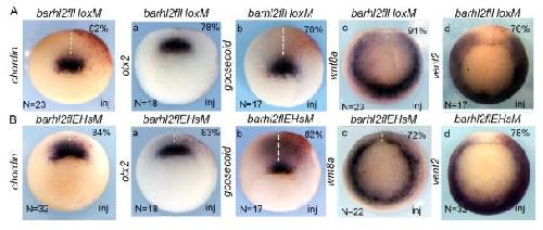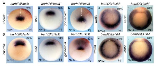 Figure S5: (A, B) ISH on embryos injected with Barhl2flHoxM (A), or Barhl2flEHsM (B) at stage (st) 10.5 using (a) chordin, (b) otx2, (c) goosecoid, (d) wnt8a or (e) vent2 as probes. Representative X. laevis embryos are shown ventral view dorsal up. Embryos were injected together with a tracer (in red) to assess area of injection. The number of embryos injected (N), as the percentage of embryos exhibiting the phenotype are indicated. inj: injected side. a white dotted line indicates the midline.