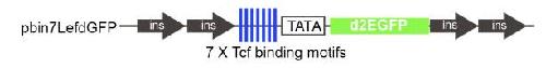 Figure S6: Scheme of the transgene Wnt reporter construct; The construct contains chicken β-globin insulators and seven Tcf consensus binding sites driving expression of a destabilized eGFP. This line allows a read-out of Wnt/Tcf activity in vivo, through either ISH using a gfp antisense probe or RT-qPCR for gfp (Tran et al., 2010; Borday et al., 2018).