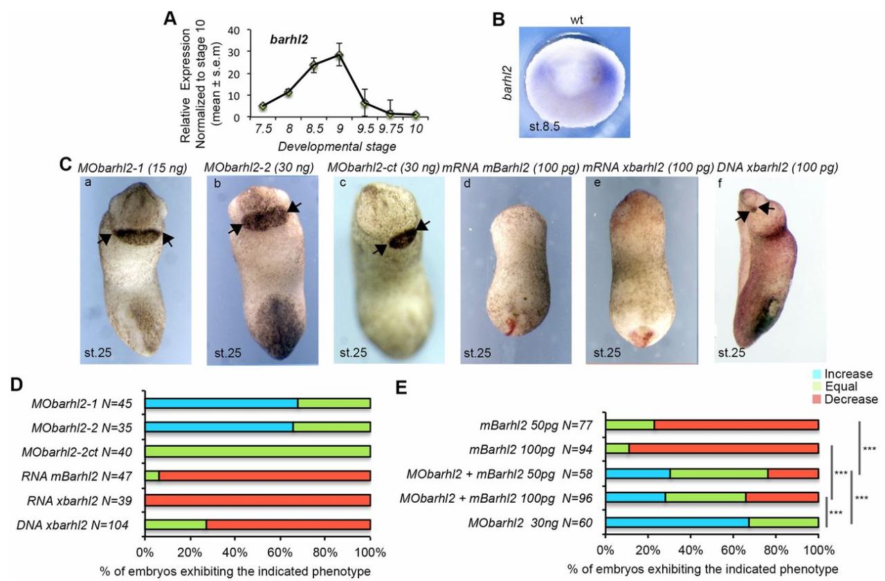 Figure 1. Barhl2 influences the establishment of the organizational plan of the Xenopus neurula. (A) RT-qPCR for Xenopus laevis barhl2 from at least 10 individual embryos stage (st)-7.5-10 embryos. Error bars correspond to biological replicates. (B) ISH using xbarhl2 as probe showing expression in the presumptive organizer territory. A half-sliced embryo at st 8.5 is shown animal side up, dorsal right. (C) Representative st-25 embryos injected as indicated. The length of the cement gland (CG, black arrow) was measured using ImageJ. A CG of 1.2 times the average size of its wt siblings is considered increased. A CG of 0.8 times the average size of its wt siblings, or absent, was considered decreased. (D) Quantification of C. (E) Quantification graph showing that Barhl2 rescues the MObarhl2-induced CG phenotype.