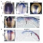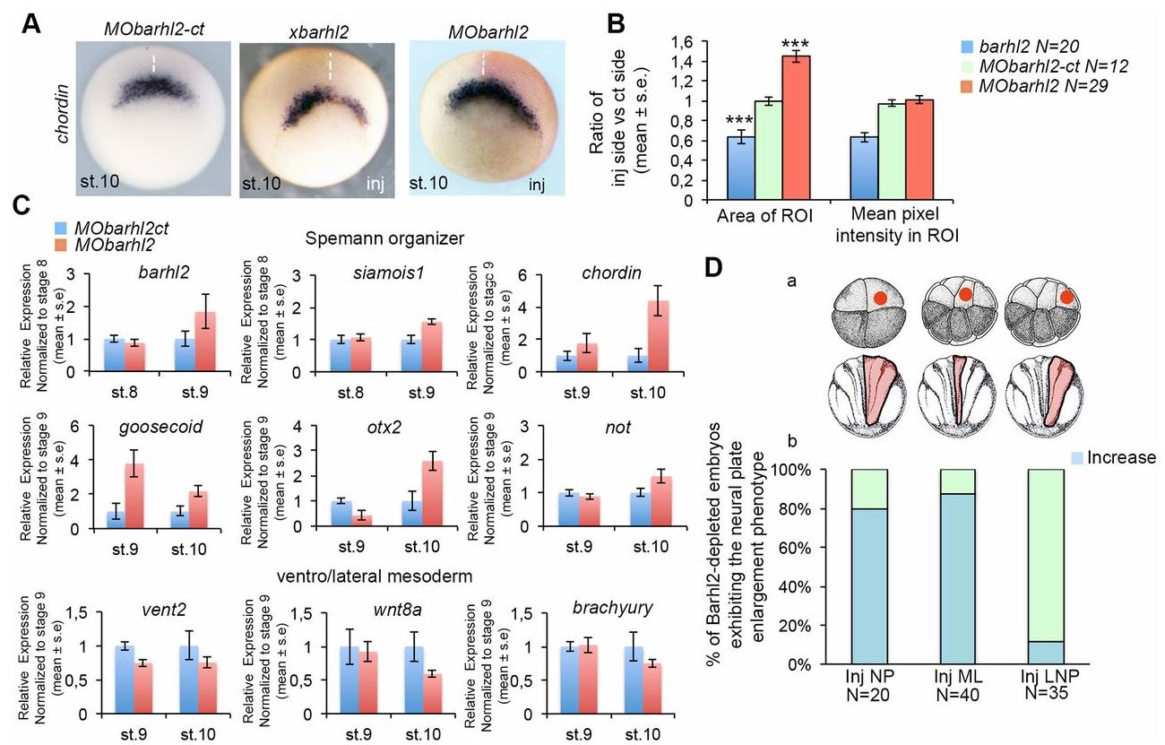 Figure 2. Barhl2 limits the extension and signaling of the Spemann organizer. (A) ISH on stage (st) 10 embryos injected (inj) as indicated using chd as a probe. (B) Quantification of ROI area and mean pixel intensity in ROI on embryos from A. (C) RT-qPCR on RNA extracted from st 8-10 embryos on Spemann organizer and ventro/lateral mesoderm genes. For each experiment (n=2), five individual embryos were lysed. (D) (a) Scheme of the experiment: embryos were injected into one dorsal blastomere at the 4- or 16-cell stage with MObarhl2 and a tracer. Dorsal view of a st-14 injected embryo showing the site of injection (red dot), and the targeted territory (in red); (b) quantification of the experiment in a. LNP, lateral neural plate; ML, midline; NP, neural plate.
