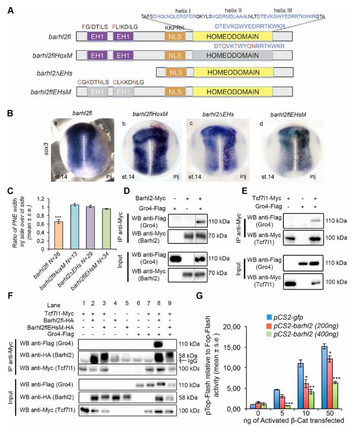 Figure 3. Barhl2 binds to Gro and limits β-Catenin-driven Tcf transcriptional activation. (A) Scheme of mBarhl2-derived constructs: the AA sequences of the Homeodomain (HD) with its three helices (AAs in blue), a NLS and its two EH1 motifs. Mutated HD and EH1 motifs are shown in pale gray. (B) ISH using sox3 as a probe in stage (st)-14 injected embryos. A dashed white line indicates the neural plate midline. (C) Quantification of B: for each embryo, the width of the posterior neuroepithelium (PNE) was measured on the injected (inj) and the control (ct) sides using ImageJ. (D-F) HEK293T cells were co-transfected with vectors (2â