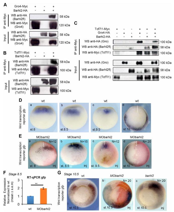 Figure 4. Barhl2 limits β-Catenin-dependent derepression of Tcf7l1 target genes in blastula embryos. (A-C) Xenopus embryos were injected with RNA encoding tagged versions of Gro4, Tcf7l1 and Barhl2fl as indicated. Co-IP was performed on protein extracts from stage (st)-10 embryos. (A) Barhl2 co-immunoprecipitates with Gro. (B) Barhl2 co-immunoprecipitates with Tcf7l1. (C) Tcf7l1 co-immunoprecipitates with Gro and Barhl2 independently. (D) WT pbin7LefdGFP embryos stained for gfp in ISH at different developmental stages as indicated. (E) MObarhl2 was injected in pbin7LefdGFP embryos and analyzed by ISH with gfp antisense probes at different stages. (F) Analysis of gfp levels by RT-qPCR. (G) MObarhl2 and mBarhl2 were injected in pbin7LefdGFP embryos, fixed at st 10.5 and analyzed by ISH with gfp antisense probes. A white-dotted line indicates the midline marked by tracer (red) staining. The dorsal blastopore lip is delimited by an unbroken white line. Inj, injected side.
