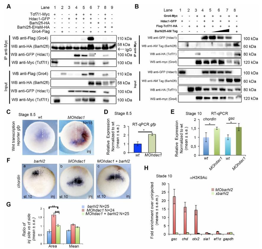 µg). Co-IP was performed on cell protein extracts. Total cell lysates and the immunoprecipitated complexes were analyzed with western blot analysis. (C,D) Analysis of Hdac1 depletion in stage (st)-8.5 Xenopus tropicalis pbin7LefdGFP embryos using (C) ISH with gfp probes and (D) RT-qPCR on RNA extracts. (E) RT-qPCR analysis on Xenopus laevis st-10 RNA using chordin and gsc as probes on embryos depleted of Hdac1 and their WT siblings. (F) ISH using chd as probe in st-10 embryos injected with (a) barhl2, (b) MOhdac1 and (c) Mohdac1 and barhl2. (G) Quantification of the rescue experiment in F. (H) ChIP-qPCR analysis showing that depletion of Barhl2 increases H3K9Ac marks at the promoter regions of key organizer genes. Graphs represent the average relative quantification for four independent experiments. A white-dotted line indicates the midline. Inj: injected side.