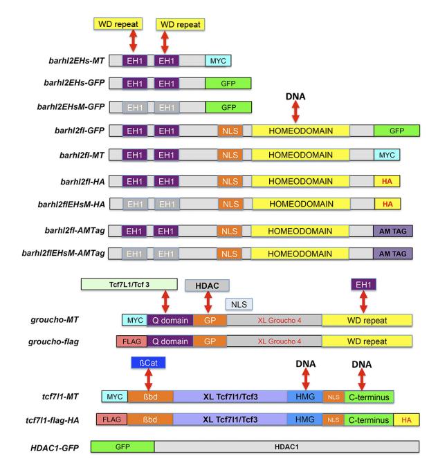 Figure S1: Scheme of tagged constructs used. Scheme of 1: Barhl2 cDNA derived constructs carrying Myc, GFP, HA and AM tags in their C-terminal end as indicated; 2: X. laevis Gro4 carrying Myc, HA or Flag tag at their N-terminal or C-terminal end as indicated; 3: X. laevis Tcf7l1 carrying Myc, HA or Flag tag at their N-terminal or C-terminal end as indicated; 4- human Hdac1 carrying GFP tag at its N-terminal end. The double arrows indicate domains of protein-protein or protein-DNA interactions.