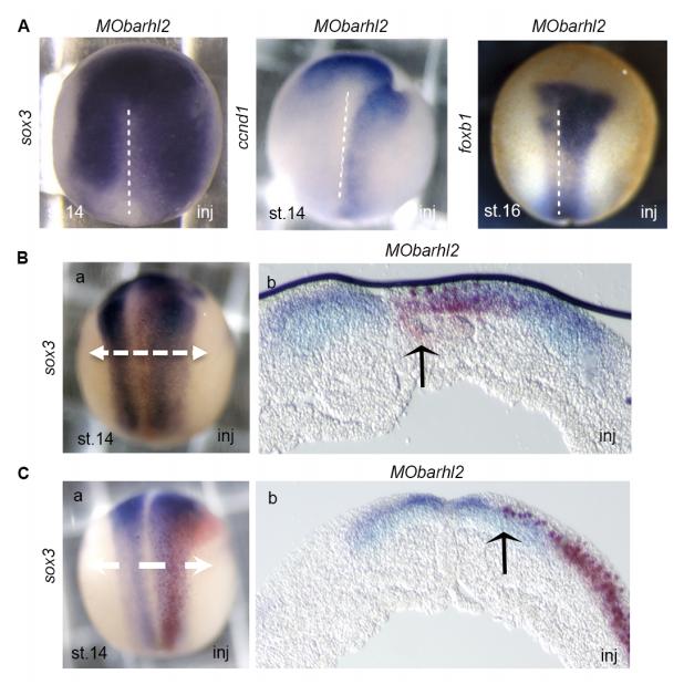 Figure S4: (A) ISH on embryos depleted for Barhl2 (MObarhl2) using sox3, an early marker of the neural plate, foxb1, a marker of hindbrain and diencephalic territories (Gamse and Sive, 2001) and ccnd1, which is regulated by both Shh and Wnt signaling (Borday et al., 2012), as probes. Representative embryos are shown dorsal view, anterior up. (B, C) ISH on embryos depleted for Barhl2 (MObarhl2) using sox3 as a probe. Representative embryos in which Barhl2 activity was depleted either (Ba) in the dorsal mesoderm (future organizer) and axial dorsal ectoderm (floor plate), (Ca) or in lateral mesoderm and lateral ectoderm are shown in dorsal view, anterior up, together with representative transverse sections (50µm) at the AP axis positions indicated with a white-dashed arrow (Bb; Cb). Embryos were injected together with a tracer (in red) to assess are of injection. The black arrow indicates the limits of the injected territory. inj: injected side. st: stage.