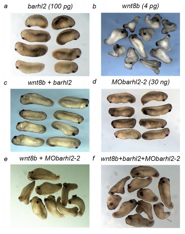 Representative X. laevis embryos are shown injected into one ventral blastomere at the 4-cell stage with (a) RNA encoding barhl2 (100 pg); (b) RNA encoding wnt8b (4 pg); (c) barhl2 (100 pg) and wnt8b (4 pg); (d) MObarhl2 (30 ng); (e) wnt8b (4 pg) and MObarhl2 (30 ng); (f) barhl2 (100 pg) with wnt8b (4 pg) and MObarhl2 (30 ng).