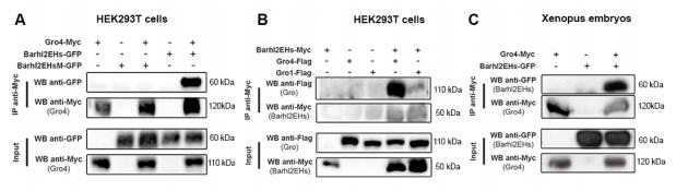 and EH1 (Roose et al., 1998; Houston et al., 2002; Owens et al., 2016), and Gro4 is required for Xenopus organizer formation (Roose et al., 1998). We observed that Barhl2EHs co-immunoprecipitated with Gro4 with a higher efficiency then Gro1, arguing that Barhl2EHs interacts preferentially with Gro4. (C) Gro4 interacts with Barhl2EHs in Xenopus embryos.