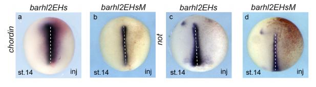 barhl2EHs or (b,d) barhl2EHsM encoding RNA are shown dorsal view, anterior up.