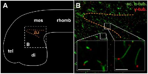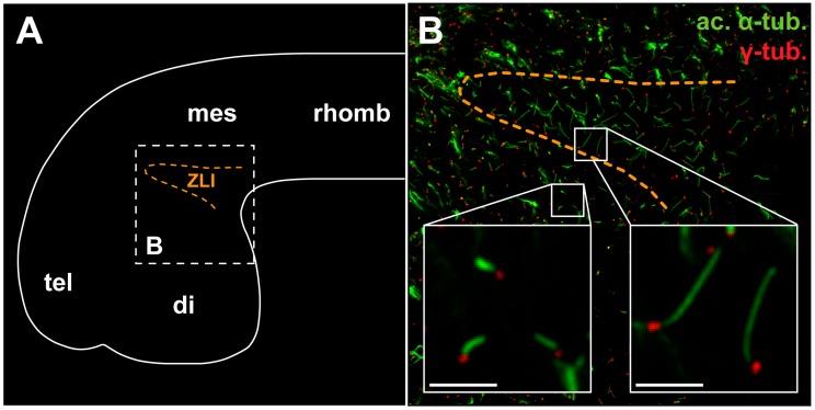 Figure 3. Elongated cilia on the zli. (A) Schematic overview of the Xenopus tadpole brain comprised of (from anterior to posterior) telencephalon (tel), diencephalon (di), mesencephalon (mes) and rhombencephalon (rhomb). The position of the zli is indicated by orange dashed line. (B) Magnification of area indicated by white dashed line in (A). Whole mount immunofluorescence staining on the ventricular surface of a tadpole brain. Antibodies detecting acetylated alpha-tubulin (ac. α-tub.) and gamma-tubulin (γ-tub.) mark cilia axonemes and basal bodies, respectively. Note that zli cilia are markedly elongated compared to cilia on neighboring cells (scale bars: 5 µm). |
