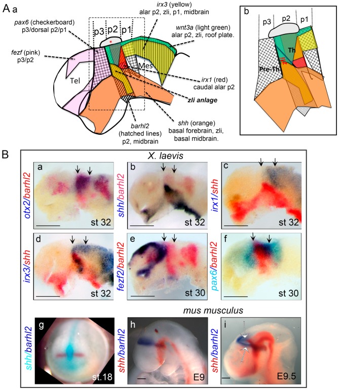 Figure 1. Schematic of Xenopus (X.) laevis forebrain markers and flat-mounted neural tubes from X. laevis and Mus musculus embryo after whole-mount double in situ-hybridization (WM-dISH). (A) Schematic of X. laevis forebrain markers at st. 30. (a) Areas of expression are shown and indicated for fezf2 (pink), pax6 (checkerboard pattern), irx3 (yellow), wnt3a (light green), shh (orange), barhl2 (hatched lines), and irx1 (red). (b) Enlargement of the diencephalic part indicated by a rectangle in (a). The pineal gland located on top of p2 is marked by an asterisk. The future zli is indicated in (b). p: prosomere; Tel: telencephalon; Mes: mesencephalon; Pre-Th: pre-thalamus; zli: zona limitans intrathalamica; Th: thalamus. (B) WM-dISH is performed using otx2, irx1, irx3, fezf2, pax6, and shh or barhl2 as probes on (aâg). X. laevis and mouse embryos at different developmental stages as indicated. Neural tubes (aâf) or heads (h,i) of representative embryos, dissected and flat-mounted, are shown from a side view, dorsal up, anterior left except for (g), shown in anterior view, dorsal side up. The markers and stages are indicated. Black arrows indicate the rostral and caudal boundaries of p2. White arrows indicate the bilateral zli. Scale bar: 0.5 mm. |
