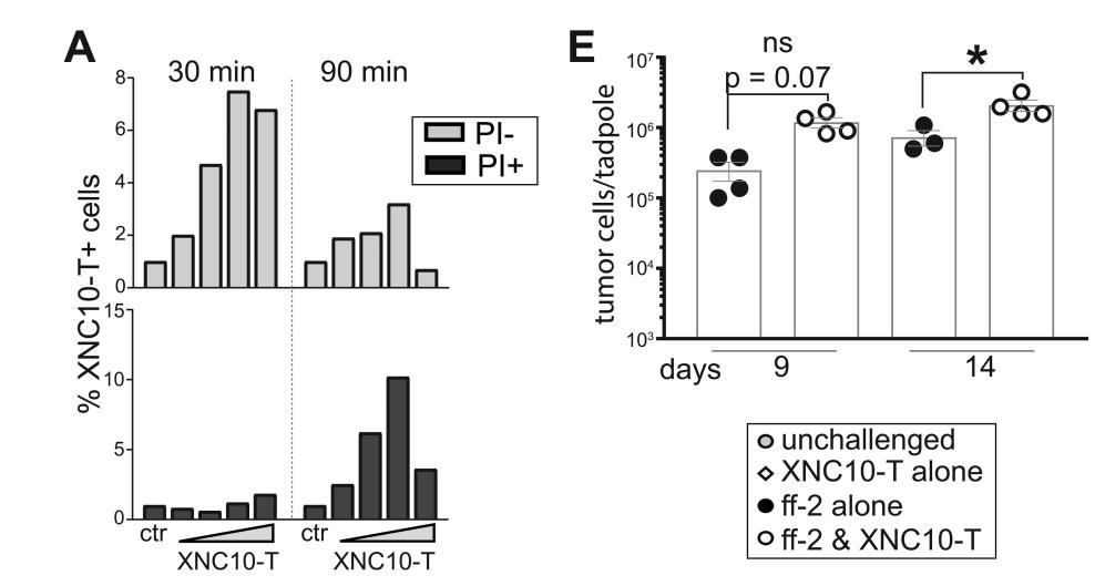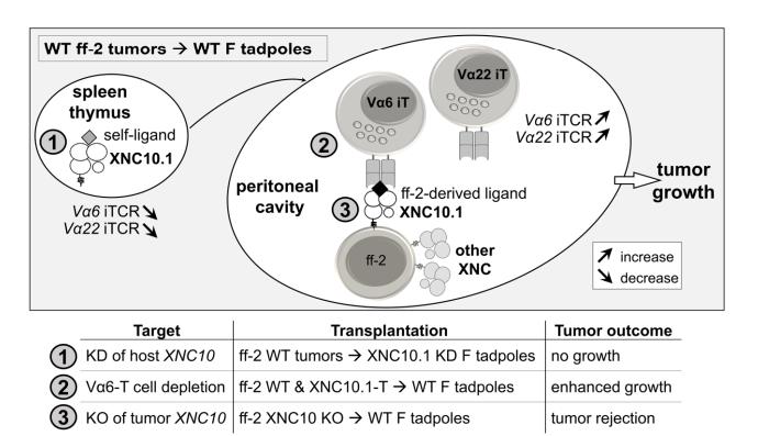 The conditions that lead to antitumor or protumor functions of natural killer T (NKT) cells against mammalian tumors are only partially understood. Therefore, insights into the evolutionary conservation of NKT and their analogs-innate-like T (iT) cells-may reveal factors that contribute to tumor eradication. As such, we investigated the amphibian Xenopus laevis iT cells and interacting MHC class I-like (XNC or mhc1b.L) genes against ff-2 thymic lymphoid tumors. Upon ff-2 intraperitoneal transplantation into syngeneic tadpoles, two iT cell subsets iVα6 and iVα22, characterized by an invariant T-cell receptor α chain rearrangement (Vα6-Jα1.43 and Vα22-Jα1.32 respectively), were recruited to the peritoneum, concomitant with a decreased level of these transcripts in the spleen and thymus. To address the hypothesize that different iT cell subsets have distinct, possibly opposing, roles upon ff-2 tumor challenge, we determined whether ff-2 tumor growth could be manipulated by impairing Vα6 iT cells or by deleting their restricting element, the XNC gene, XNC10 (mhc1b10.1.L), on ff-2 tumors. Accordingly, the in vivo depletion of Vα6 iT cells using XNC10-tetramers enhanced tumor growth, indicating Vα6 iT cell-mediated antitumor activities. However, XNC10-deficient transgenic tadpoles that also lack Vα6 iT cells were resistant to ff-2 tumors, uncovering a potential new function of XNC10 besides Vα6 iT cell development. Furthermore, the CRISPR/Cas9-mediated knockout of XNC10 in ff-2 tumors broke the immune tolerance. Together, our findings demonstrate the relevance of XNC10/iT cell axis in controlling Xenopus tumor tolerance or rejection.