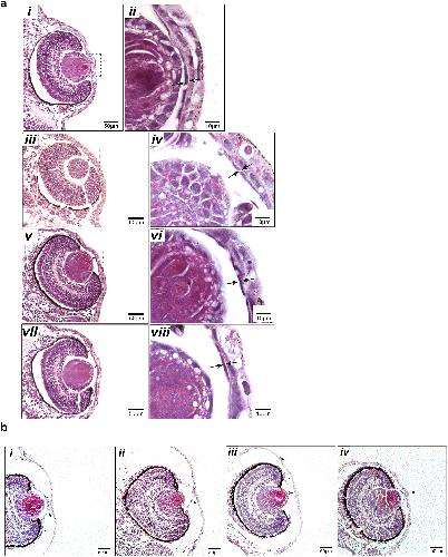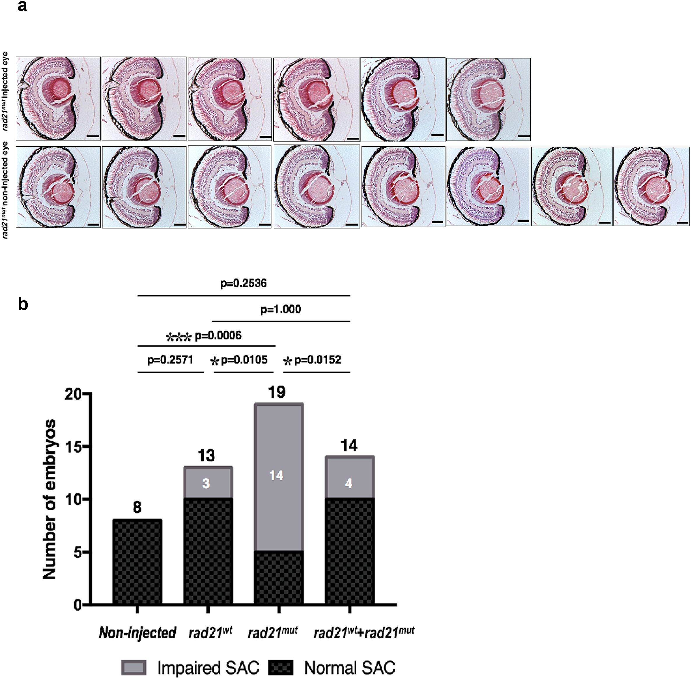 Fig. 5. Thinner SAC in rad21mut injected eyes. a. Consecutive sections showing the difference in SAC thickness between the injected and non-injected side of an embryo in the rad21mut group. Each image represents histology section of 5 μm thickness. For this embryo, the SAC is around 10 μm thinner in the rad21mut injected side compared with the non-injected side. Scale bar: 50 μm. b. The number of embryos with normal SAC and impaired SAC in each group. Numbers of embryo in each group are listed above the bars. Numbers of embryo showing impaired SAC are shown within the bars. Statistics is done by using Fisher's exact test. * indicates statistical significance of p < 0.05. *** indicates statistical significance of p < 0.01.