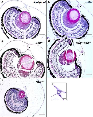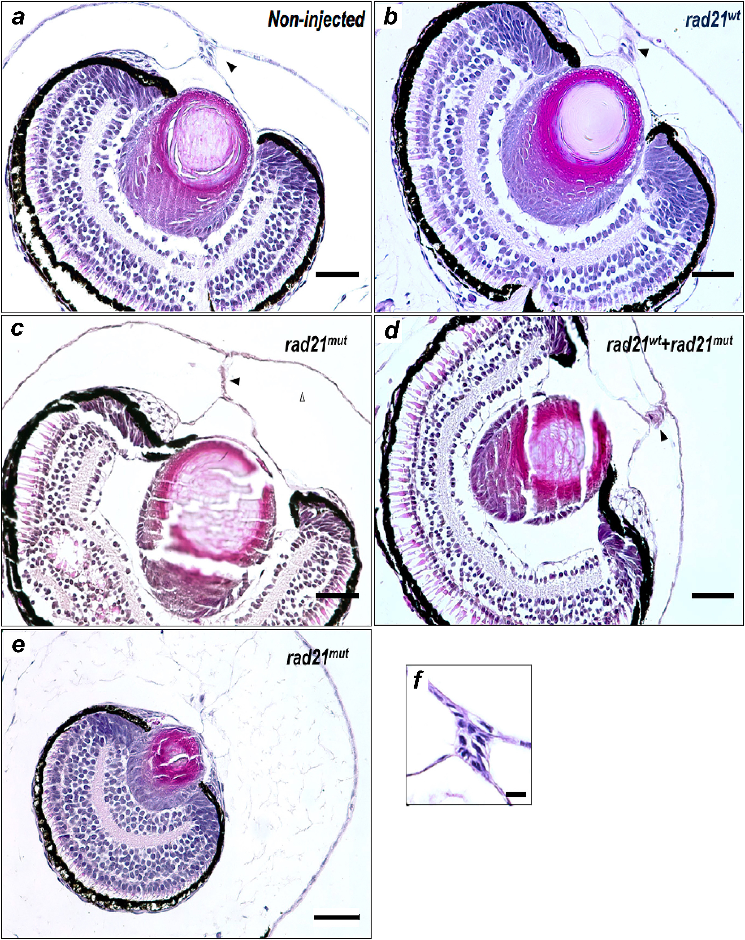 Fig. 4. Defective development of SAC in rad21mut injected eyes at stage 47–48. a. The non-injected eye with stroma attracting center (SAC) indicated with an arrowhead (scale bar: 50 μm). b. The rad21 wt injected eye with an intact SAC (scale bar: 50 μm). c. The rad21mut injected eye with underdeveloped SAC (scale bar: 50 μm). d. The SAC structure is restored in the rescue (rad21 wt + rad21mut) group (scale bar: 50 μm). e. More severe case in rad21mut injected eye, with total absence of SAC structure (scale bar: 50 μm). f. The magnified view of the SAC from a. The SAC structure is composed with cuboidal shaped cells (scale bar: 10 μm).