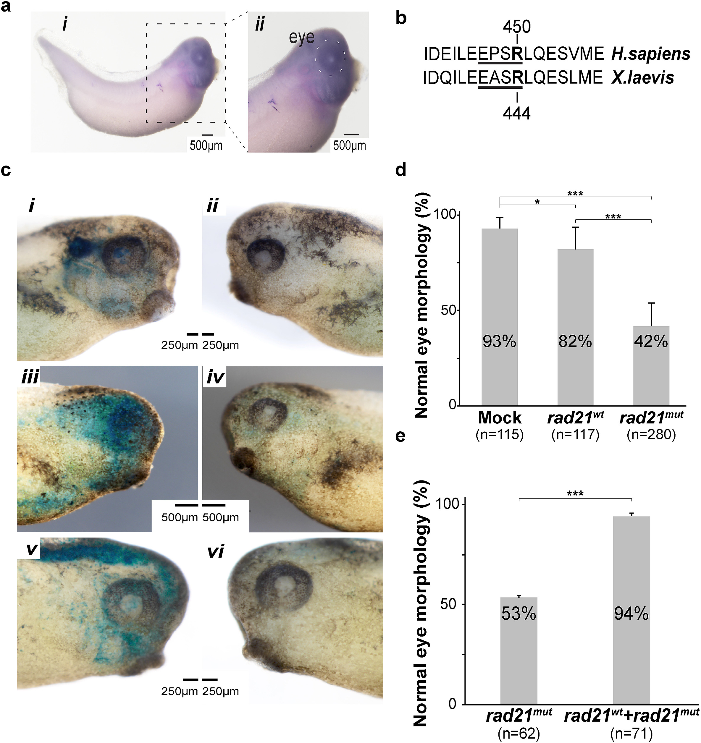 Fig. 1. rad21mut disrupts eye development in X. laevis. a. rad21 is highly expressed in the head of stage 39 X. laevis embryo. The white dash cycle highlights the eye region of high rad21 expression (purple). b. Arg450 of human RAD21 is located within the EXXR motif and is conserved as Arg444 in X. laevis rad21. c. Panel i shows the embryonic side co-injected with rad21â¯wt and LacZ. Blue staining indicates the LacZ expression, which is used as a proxy to reflect the region expressing the injected materials. Panel iii shows the embryonic side co-injected with rad21mut and LacZ. Panel iii shows a deformed eye morphology. Panel v indicates the embryonic side co-injected with rad21â¯wt, rad21mut and LacZ. Panel ii, iv and vi, corresponding to panel i, iii and v, show the other side of the same embryos without mRNA injection. No observable eye morphology difference was detected between panel i and ii. In panel vi, co-injection of rad21â¯wt with rad21mut rescued the deformed eye morphology. d. Eye morphology quantification of the non-injected, rad21â¯wt and rad21mut injected embryos. Percentages of normal eye morphology on the injected side are shown. Embryo numbers per group are listed under group names. Error bars represent standard deviations. Statistics is done by Chi-square test with * and *** indicating p < 0.05 and p < 0.01 respectively. e. Eye morphology quantification on the injected side of the rad21mut and the rescue group embryos. Numbers of embryo are listed under group names. Error bars represent standard deviations. Statistics is done by Fisher's exact test and *** indicates p < 0.01. . (For interpretation of the references to color in this figure legend, the reader is referred to the Web version of this article.)