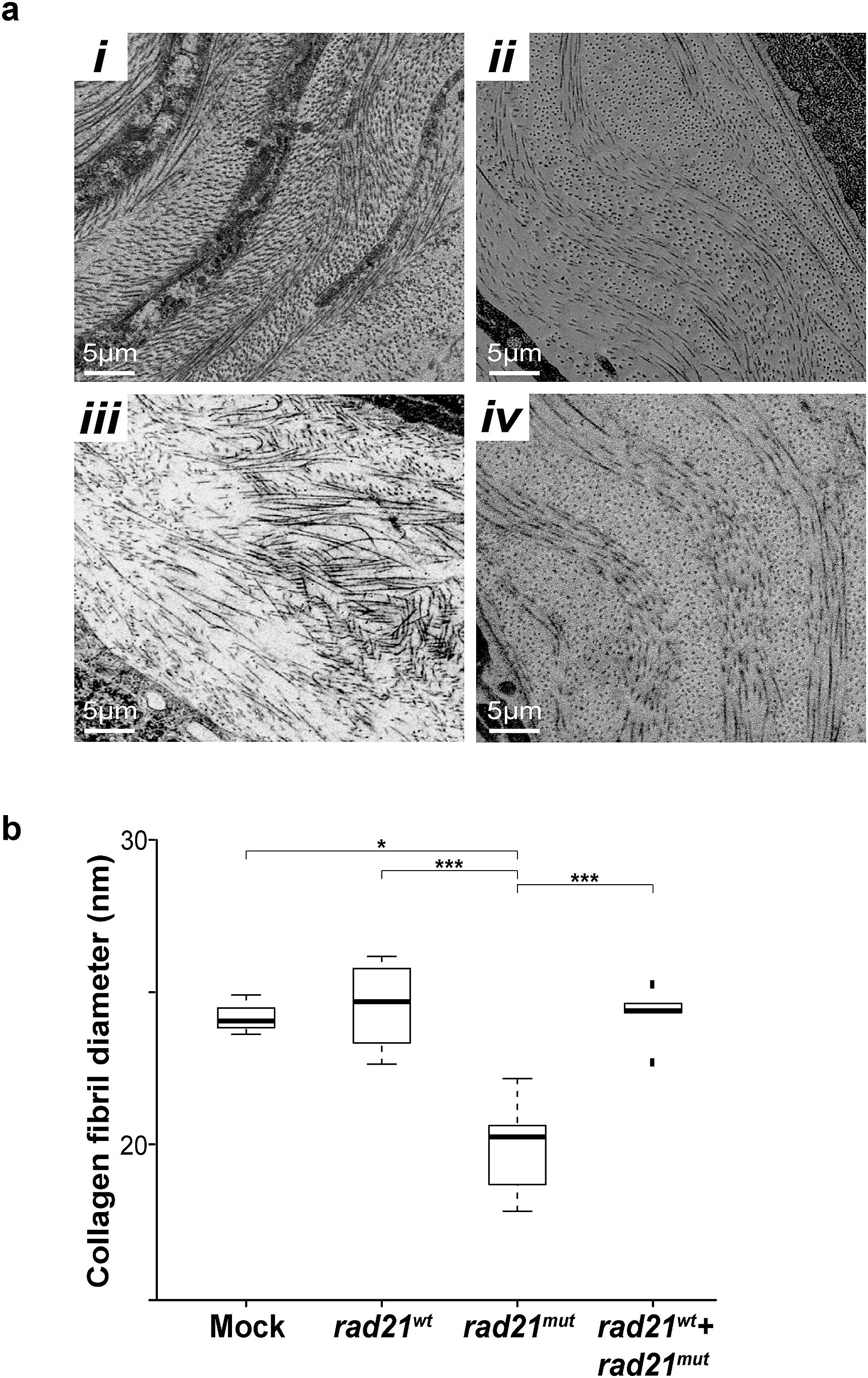 a. Electron microscopy images of collagen fibrils in corneal stroma. Organized pattern of collagen fibrils were observed (i) in non-injected eyes, (ii) in eyes with rad21wt injection and (iv) in eyes co-injected with rad21wt and rad21mut. Panel iii shows disrupted collagen fibril organization in eyes with rad21mut injection. b. Quantification of diameters of cornea collagen fibrils. For each group, at least 100 cornea collagen fibrils were counted. Error bars represent standard deviations. Statistics is performed using Mann-Whitney U test with * and *** indicating p-values of 0.0238 and 0.0043 respectively.