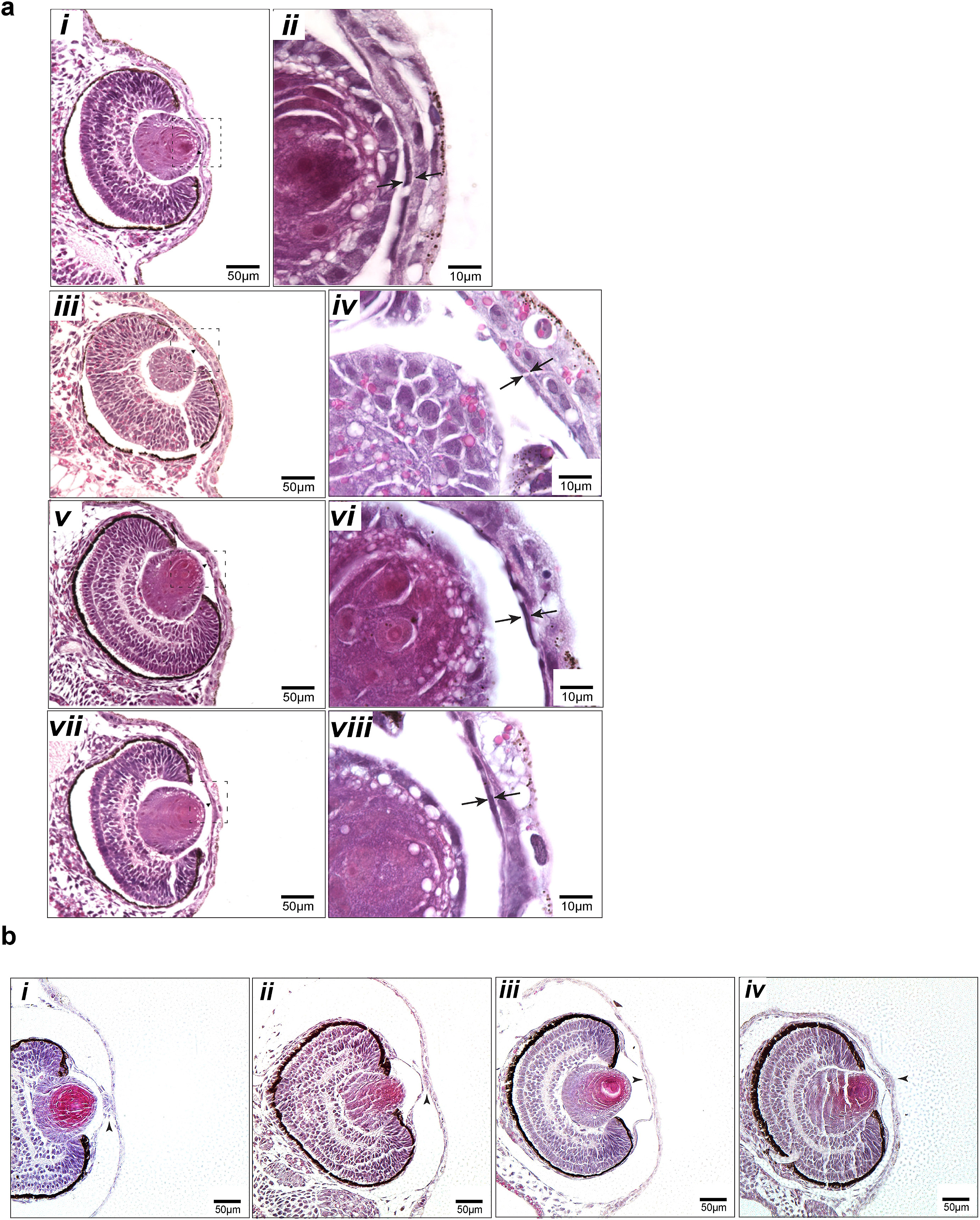 Fig. 3. Development of stromal attracting center (SAC) was influenced by rad21 variant at stage 41–42. a. No structural difference is observed in the presumptive corneal endothelium (indicated by arrowheads) among the eyes of non-injected, rad21 wt injected, rad21mut injected and the rescue group embryos at stage 37–39 (scale bar: 50 μm). b. Developmental differences in SAC among the eyes of non-injected, rad21 wt injected, rad21mut injected and the rescue group embryos at stage 41–42 (scale bar: 50 μm). Arrowheads indicate the small group of cells assembled in the center between the outer cornea and the inner cornea.
