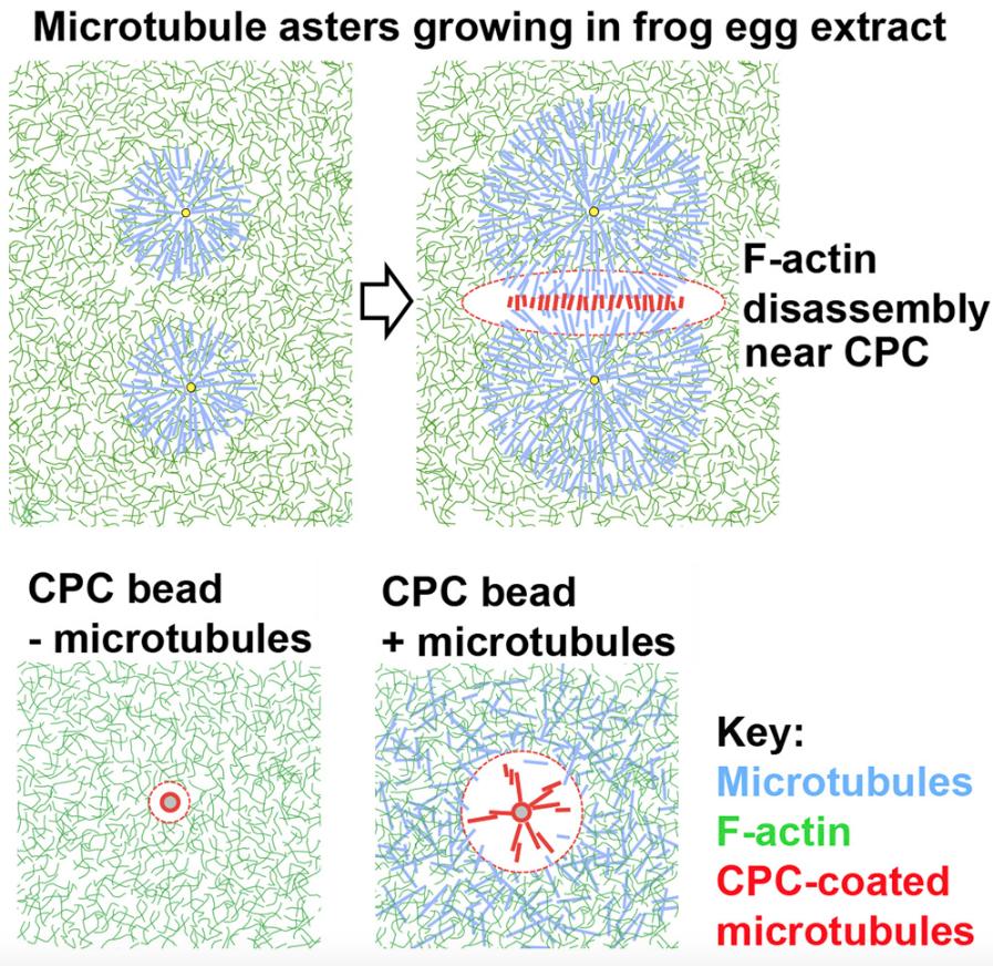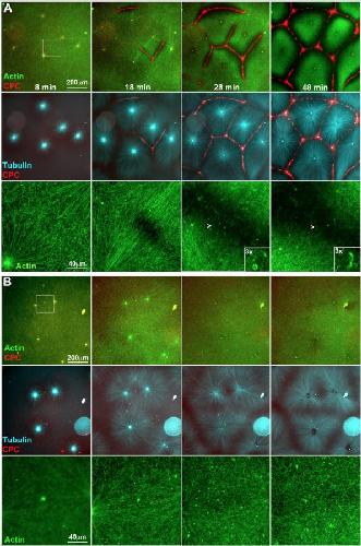 (A) F-actin clearing around 7-μm CPC beads in the absence of microtubules. t = 45 min.