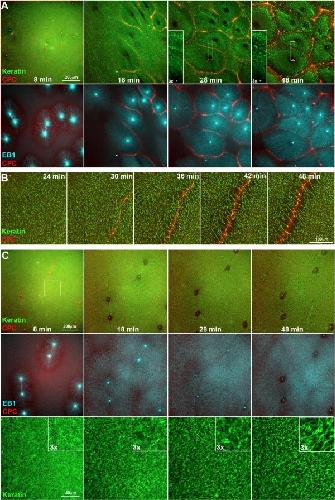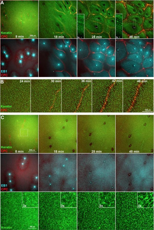 (A) Control reaction containing probes for keratin (Alexa 568-anti-keratin IgG), CPC (Alexa 647-anti-INCENP IgG), and growing microtubule plus ends (EB1-GFP). Note the partial disassembly of keratin at boundaries between asters where CPC is recruited. Keratin aggregates transiently accumulated at boundary lines, noticeable at 28 min in this example. See Video S6, which shows a different control experiment.