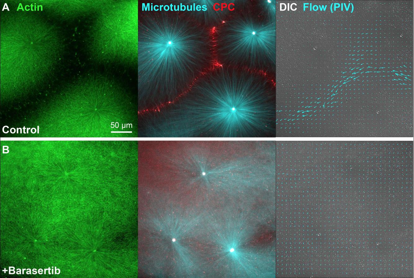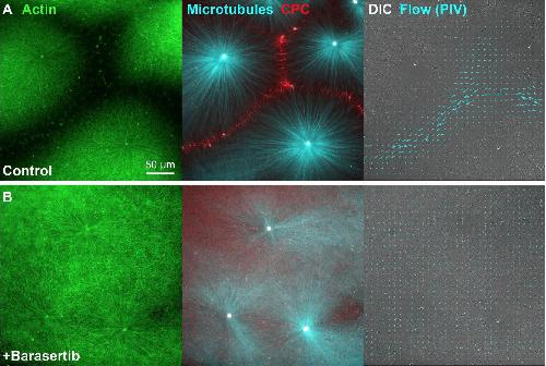 (A) Flow in an aster assembly reaction similar to Figure 1A. Fluorescent images were collected immediately before initiating flow. Actin (Lifeact-GFP), tubulin (Tau peptide-mCherry), and CPC (anti-INCENP-Alexa 647). Right: a DIC still image taken from a 20-s movie collected immediately after inducing flow with a pressure transient. Cyan arrows indicate the velocity of particle movement, measured by particle image velocimetry (PIV) analysis of two sequential frames from the movie. Flow occurred preferentially through the F-actin-free channels between asters. Peak flow in this example was â¼7 μm/s.