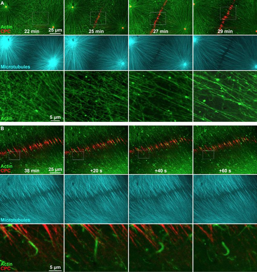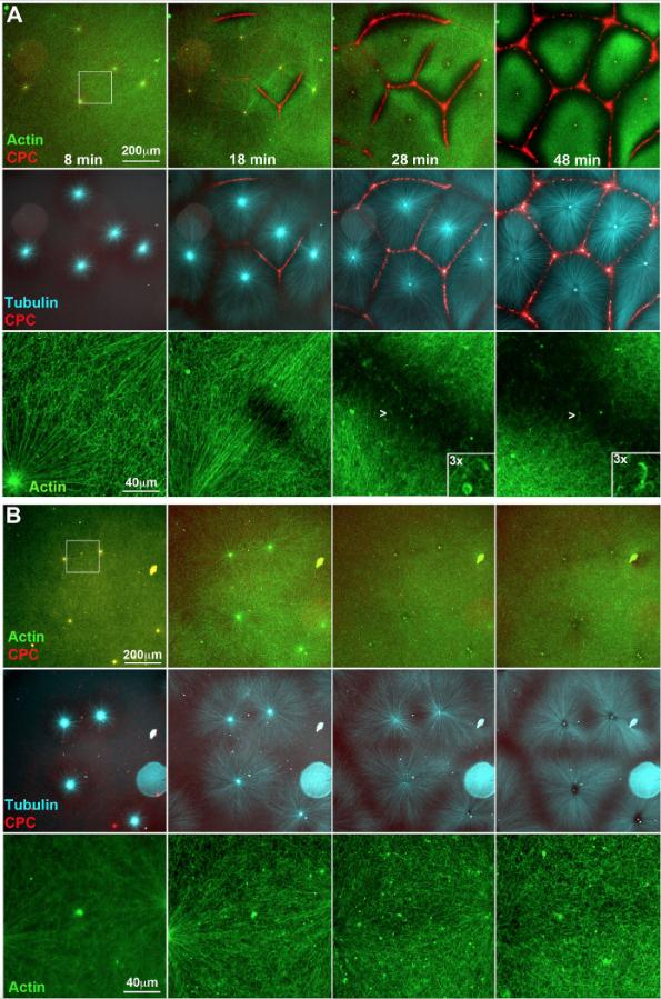 (A) Control reaction containing probes for F-actin (Lifeact-GFP), CPC (Alexa 647-anti-INCENP IgG), and microtubules (Tau peptide-mCherry) imaged by wide-field epifluorescence with a 20Ã objective. Note recruitment of CPC to anti-parallel microtubule bundles at boundaries between asters, and loss of F-actin bundles where CPC is recruited. Third row: higher-magnification views of the boxed region from the top left panel. Note the F-actin comet tails in the cleared region (chevrons, and 3Ã insets). See Videos S1 and S2.