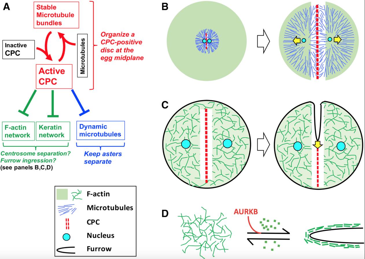 (A) Summary of molecular activities of the CPC. Red arrows indicate a positive feedback loop that promotes recruitment and spreading of the CPC on microtubule bundles at aster boundaries [2, 7]. Green and blue negative arrows indicate AURKB-dependent inhibition of all three cytoskeletal systems, presumably via reaction-diffusion mechanisms.