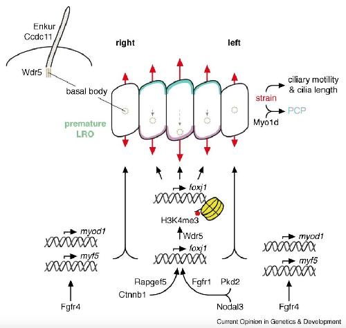 Induction of foxj1 in central LRO precursor cells requires canonical Wnt signaling as well as signaling through Fgfr1. The latter is activated by the unconventional FGF ligand Nodal3, synergizing with Polycystin-2, whereas the former requires rapgef5, which presumably regulates nuclear import of Ã-catenin (Ctnnb1). Lateral flow-sensing LRO cells depend on FGF signaling through receptor 4, which activates myf5 and myod1 in these cells that are fated to integrate into the somites. Accessibility of the foxj1 promoter is regulated by methylation of histone H3 (H3K4me3); for assembly of the methyltransferase enzyme complex, Wdr5 constitutes a central scaffolding component. Mechanical strain (red arrows) exerted on the involuting LRO precursor causes PCP-dependent posterior polarization of LROcilia, which become motile in a strain-dependent and foxj1-dependent manner. The foxj1 gradient of gene expression (cf. Figure 1) is reflected by a medial-lateral gradient of cilia lengths and polarization. PCP is acted upon as well by the unconventional myosin Myo1d. Novel ciliary factors acting on cilia include Wdr5 (at the ciliary base) and Ccdc11 as well as Enkur (in the ciliary axoneme). These factors await detailed functional characterization.