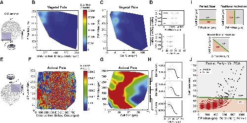 (B, C, F, and G) Heatmap contour plot of nuclear EU-RNA amount as a function of Z-position and distance from embryo center within the vegetal pole (B) and animal pole (F), and of Z-position and cell size within the vegetal pole (C) and animal pole (G). Color scales indicate low (blue) to high (red) transcription.