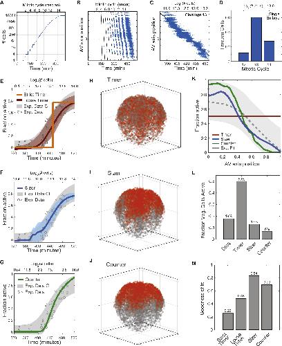 (E) Distribution of mitotic cycles as a function of time for 100 simulated embryos.