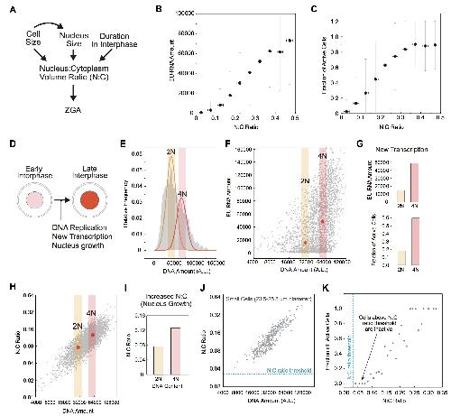 (K) Fraction of transcriptionally active cells as a function of N:C ratio for small cells (23.5-25.5 µm cell diameter). Data were binned in 0.01 increments of N:C ratio. Many cells whose N:C ratio has surpassed the threshold remain inactive.