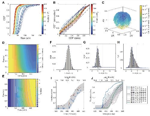 (D) Distribution of cell sizes as a function of time for 100 simulated embryos.
