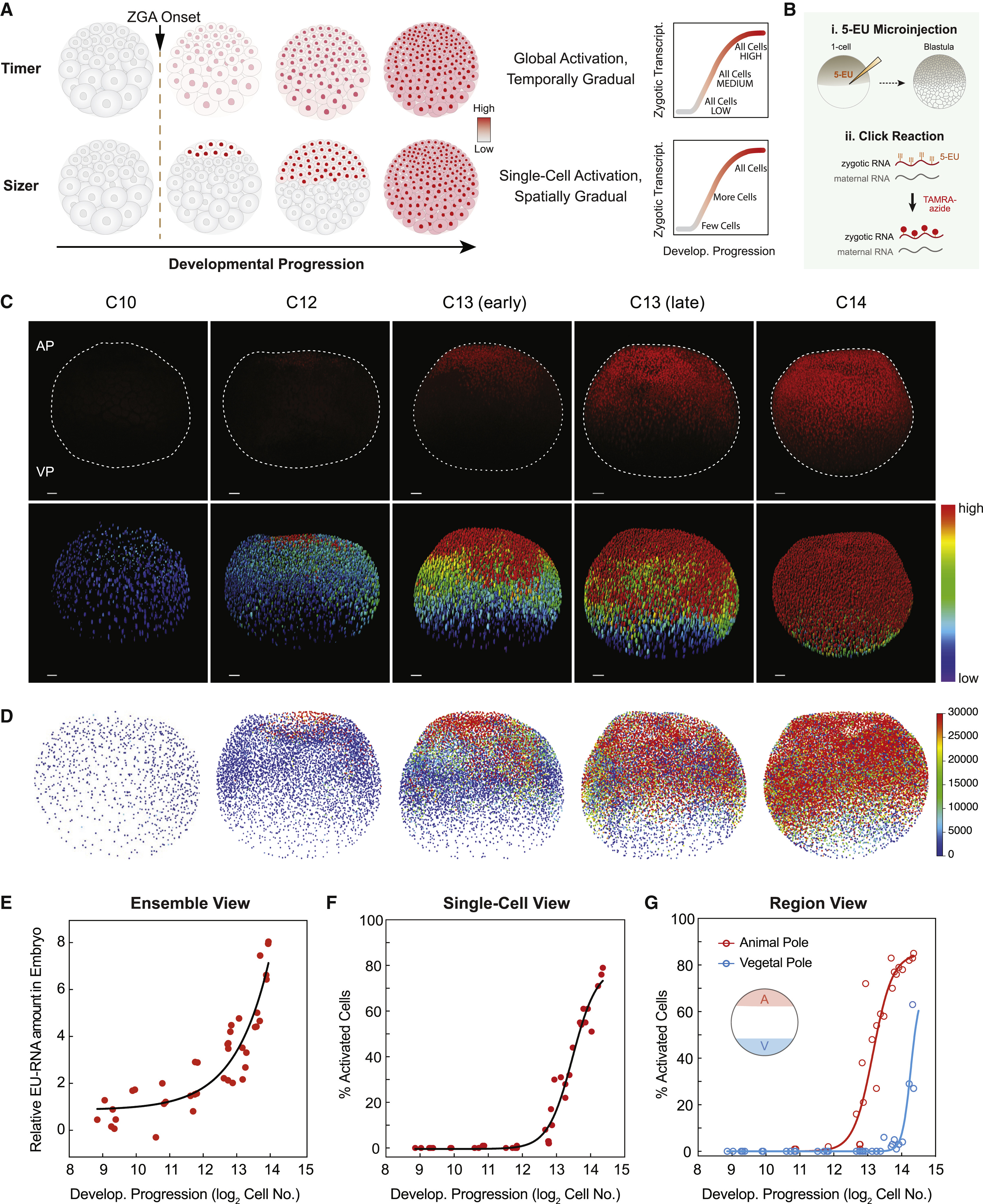 (E–G) Ensemble view (E), single-cell view (F), and regional view (G) of ZGA. Each point indicates one embryo. Exponential (E) or sigmoidal (F and G) fit to data as visual aid.