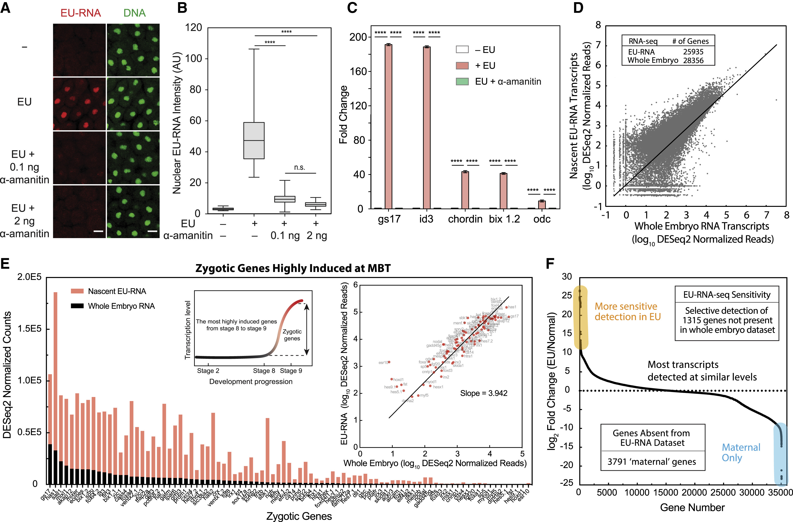 (E) Ensemble view of ZGA: total nascent EU-RNA amount with background subtraction within entire blastula embryos.