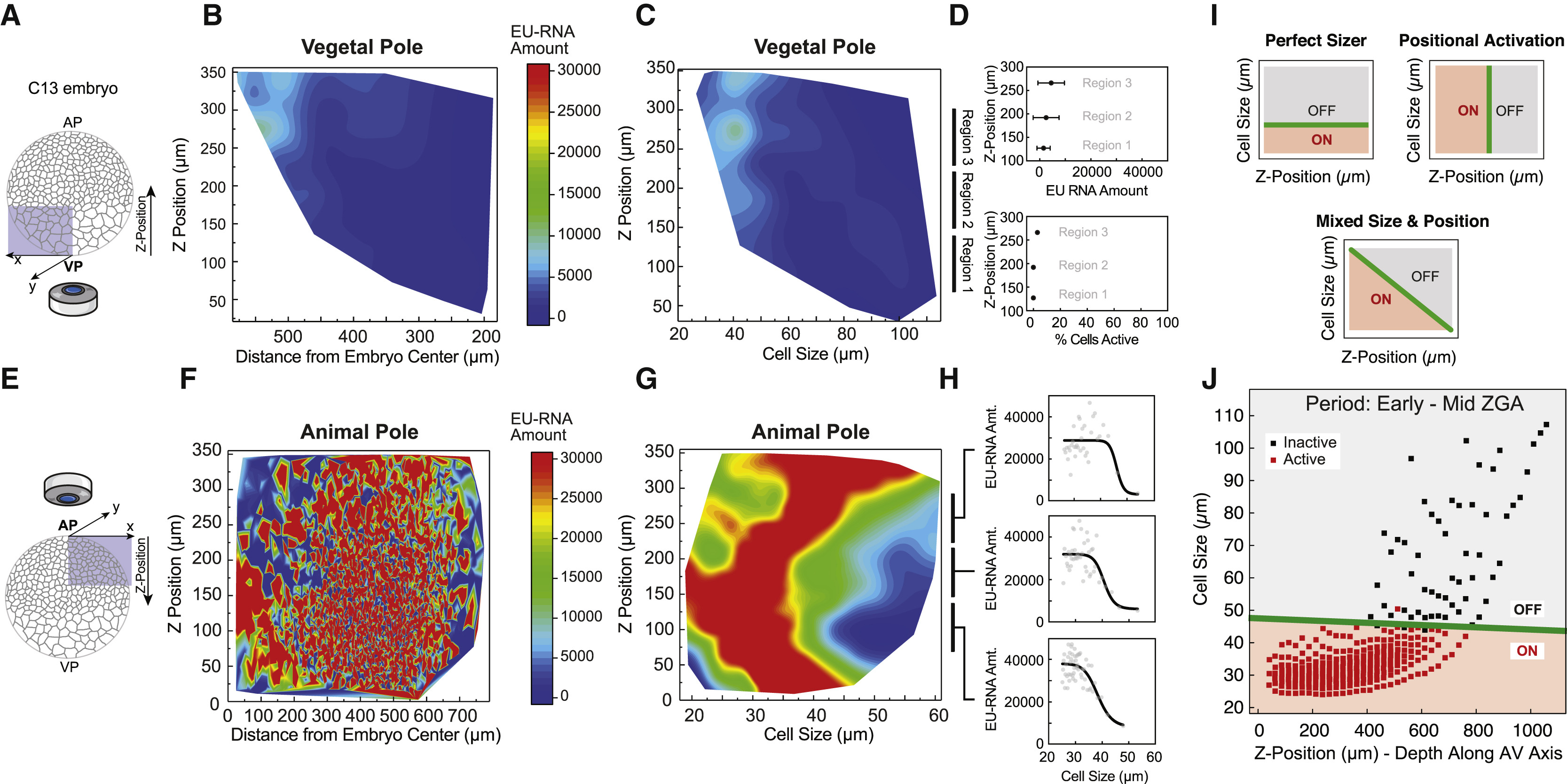 (J) Logistic regression boundary decision for ZGA as a function of cell size and Z-position along the AV axis. Each point is a bin of 25 μm by Z-position followed by a bin of 250 cells for each of 8 embryos at ∼C12.8–C13.5. Binary activation based on threshold amount EU-RNA. Black square, inactive cells; red square, active cells; green line, decision boundary of ZGA.