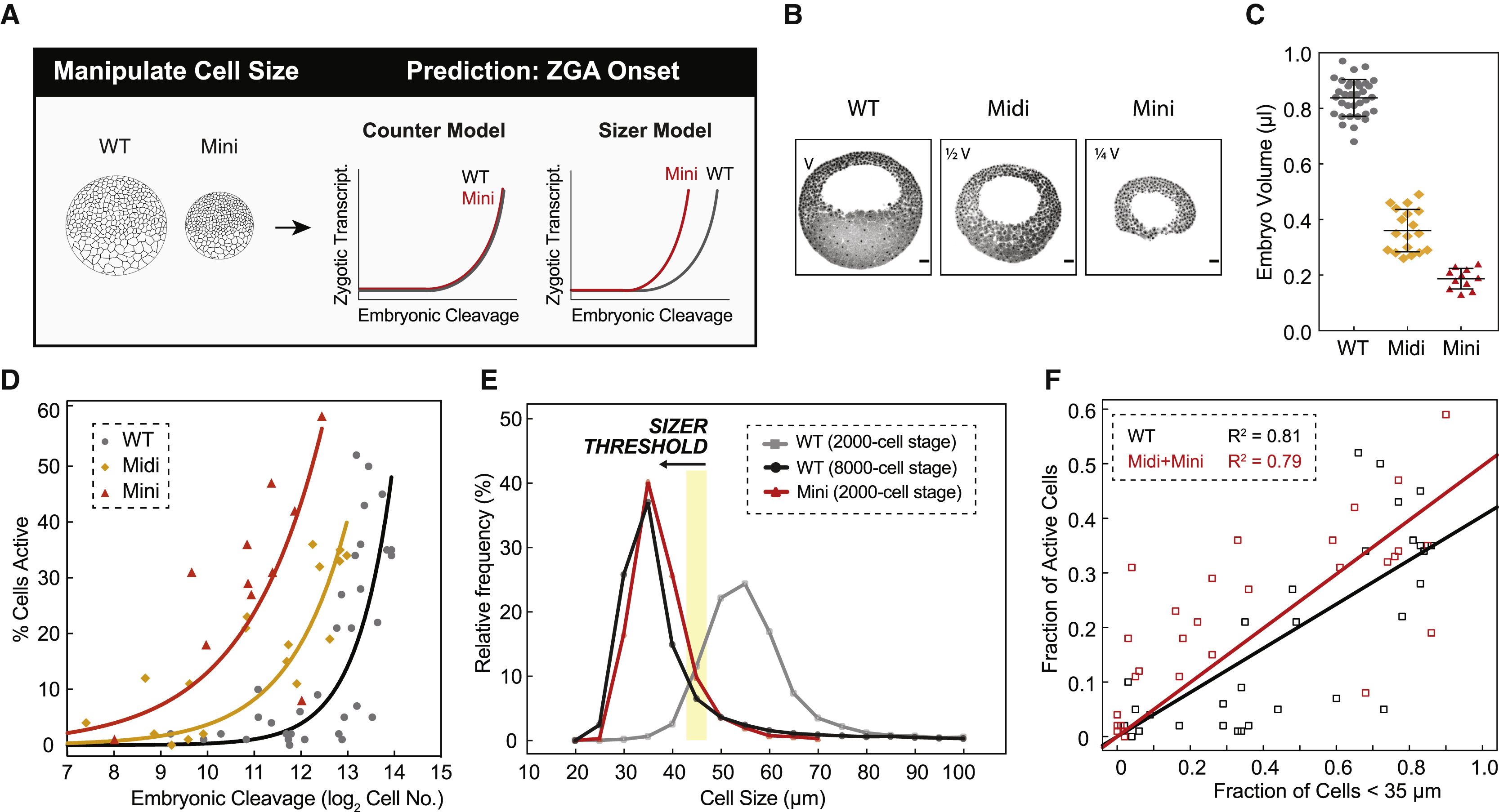 Figure 6. Premature ZGA in Miniature Embryos Rules out a Cell-Cycle Counter Model and Supports a Cell Sizer Model for ZGA.