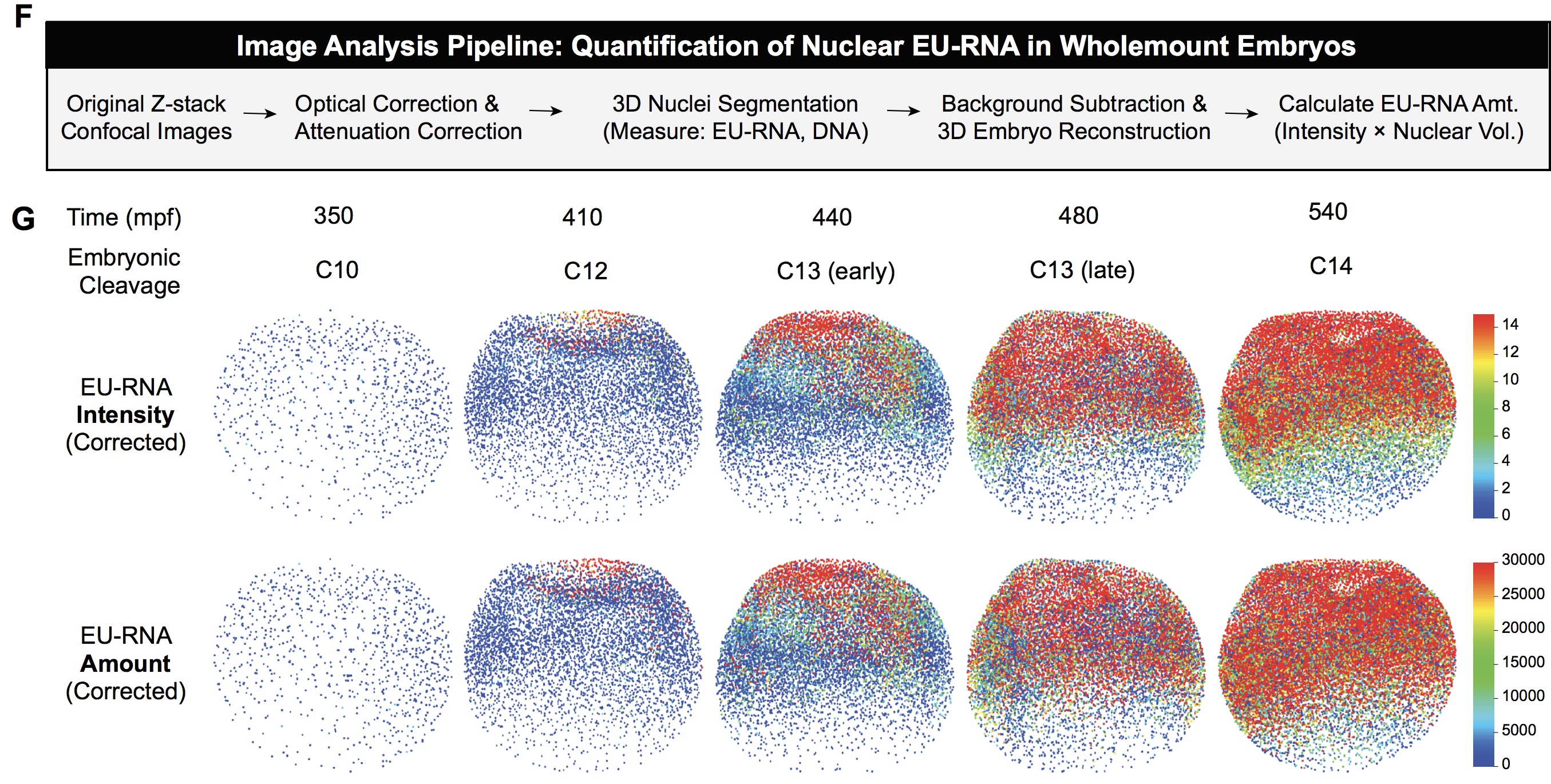 (F) Image analysis pipeline for quantification of nuclear EU-RNA intensity and amount in wholemount Xenopus embryos at