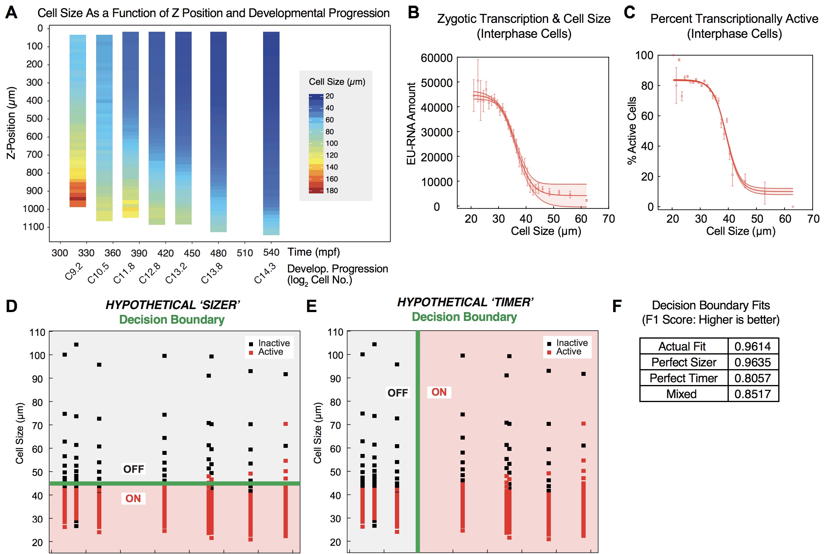(E) Predicted logistic decision boundary based on perfect timer. Red, active cells; black, inactive cells. Green line indicates decision boundary. Data points are bin averages of 200 cells from 8 embryos at early-mid ZGA (log2 cell no.=12.8-13.5).