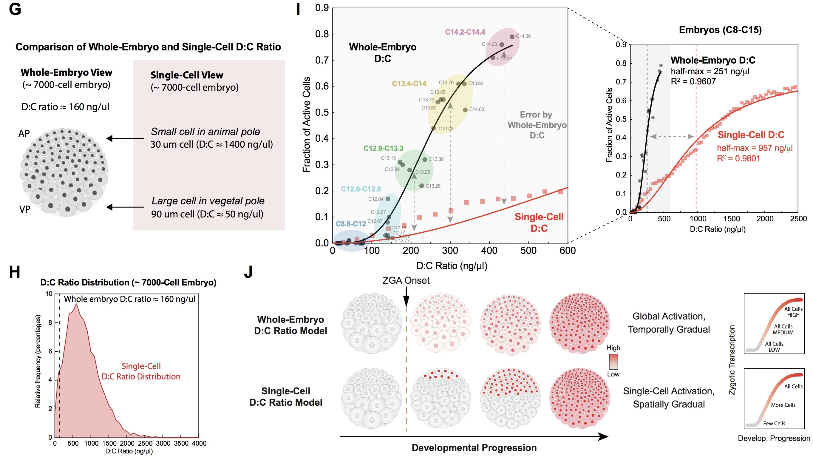 (I) D:C ratio as a function of fraction of transcriptionally active cells for both whole-embryo D:C ratio and single-cell D:C