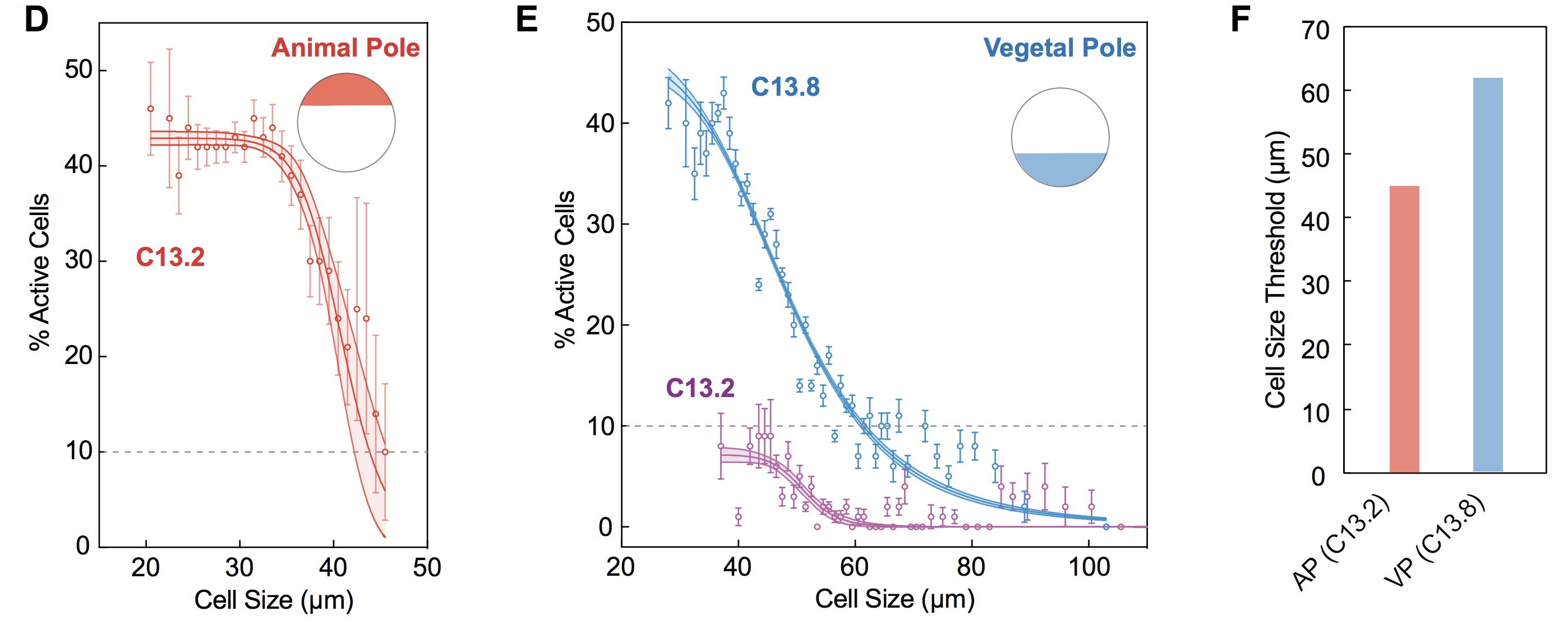 (F) Cell size threshold for transcription at the animal and vegetal pole. We define ZGA initiation for a bin of cells as 10% of cells being activated. Here this occurs at a size threshold of ~ 45 µm at the animal pole and ~ 62 µm at the vegetal pole. Data fit using Hill function, with 95% CI band.