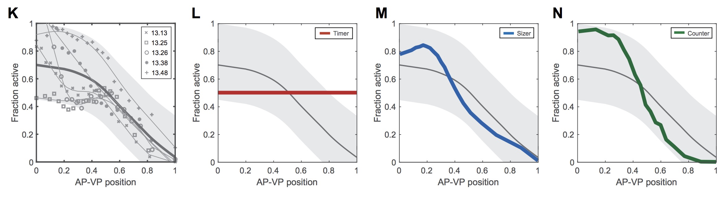 (K) Predicted fraction of activated cells along the AV axis. Comparing experimental data (gray dotted line and CI) versus computationally simulated models: timer (red), sizer (blue), and counter (green).