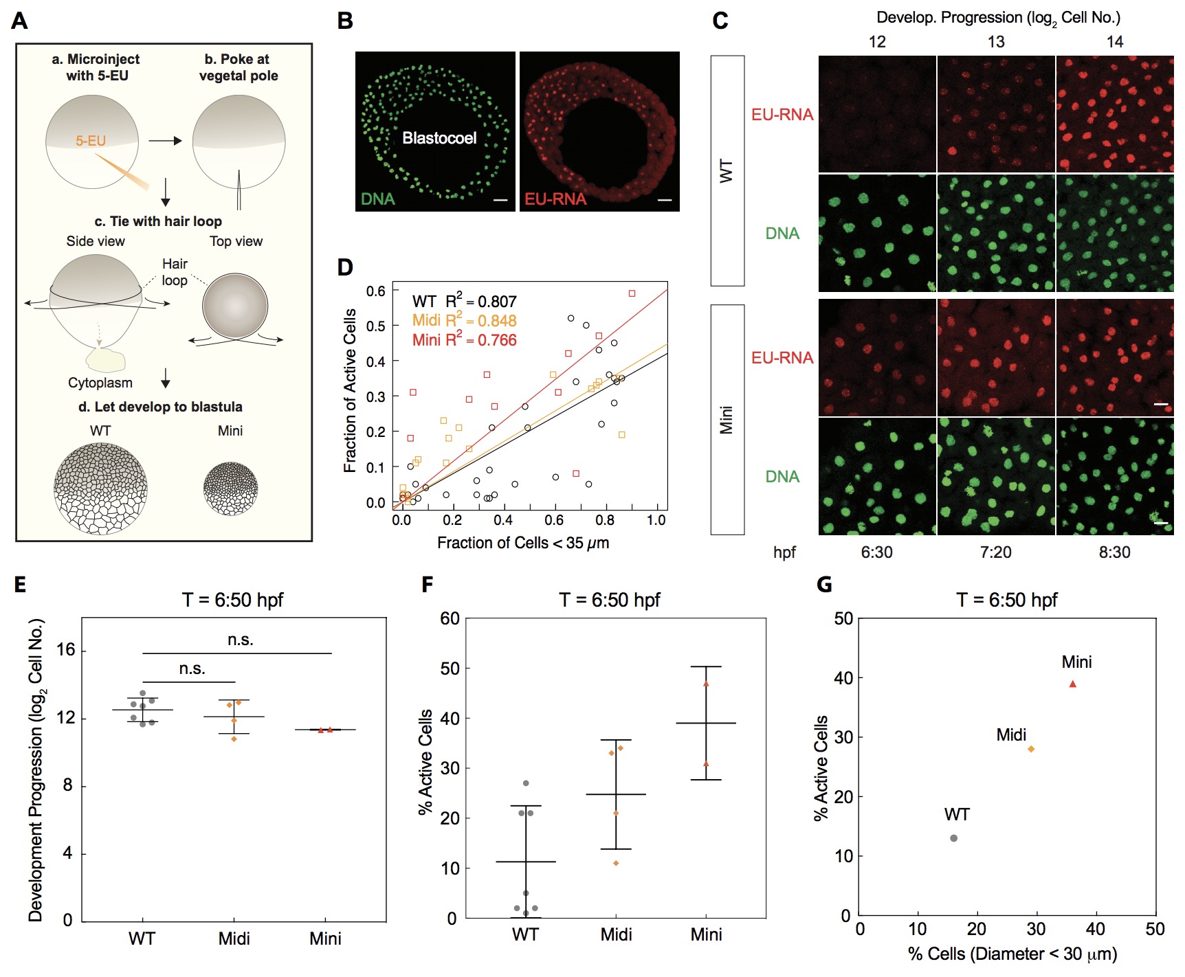 (F) Fraction of transcriptionally active cells as a function of cells smaller than 35 μm for WT (black) and midi and mini (red) embryos. Each square indicates one embryo. Linear fits to data.