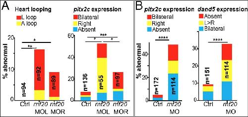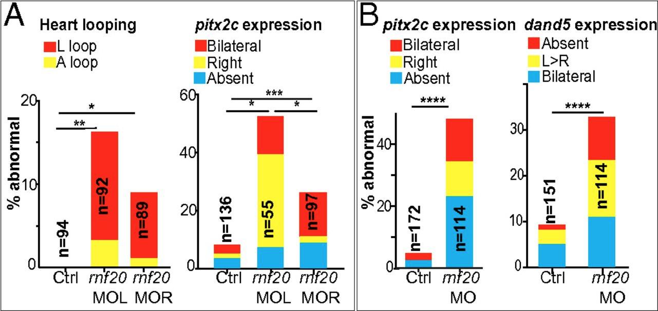 Figure 2. Rnf20 depletion in Xenopus causes leftâright abnormalities. (A, Left) Percentage of Xenopus embryos with abnormal cardiac looping after injection of rnf20 MO into either the right or left blastomere at the two-cell stage. (A, Right) Percentage of embryos with abnormal pitx2c in one-cell injections of two-cell embryos. MOL, left blastomere injection; MOR, right blastomere injection. n, number of embryos from three independent experiments. Ï2/Fisherâs exact test, ***P < 0.0005, **P < 0.005, *P < 0.05. (B) Expression of LR markers in one-cellâinjected embryos. (B, Left) pitx2c expression. (B, Right) dand5 expression. n, number of embryos from three independent experiments. Ï2/Fisherâs exact test, ****P < 0.00005.
