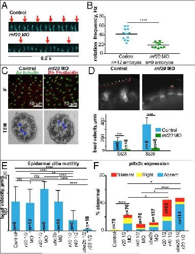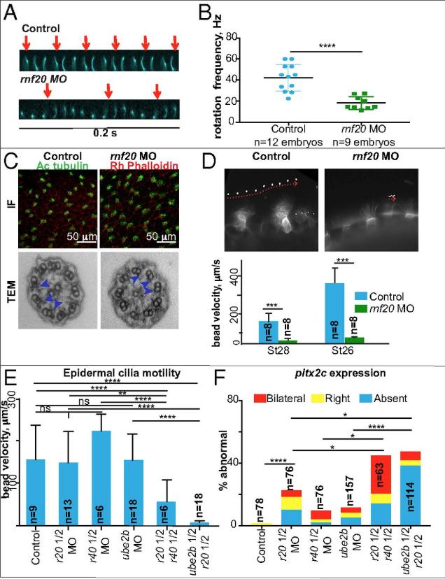 Figure 3. Cilia motility is impaired in Xenopus embryos depleted of components of the RNF20 complex. (A) Cilia beat frequency (CBF) in Ctrl and rnf20 MO LRO explants. Cilia were visualized by expressing Arl13b-GFP. Time-lapse montage of a single cilium. The space between the red arrows represents the number of frames of a ciliary single cycle. (B) Quantification of CBF in the LRO in Ctrl and rnf20 MO-injected embryos. Unpaired t test, ****P < 0.00005. (C, Top) Lateral view of an embryo with the epidermal multicilia labeled with antiacetylated tubulin and F-actin stained with phalloidin. (C, Bottom) TEM of Xenopus Ctrl and rnf20 morphant embryo epidermal cilia. IDAs are indicated by blue arrowheads. (D, Top) Analysis of epidermal cilia motility by tracking the fluorescent bead trajectory on the epidermal surface. Maximum projection of time-lapse images obtained during 0.3 s demonstrates the distance traveled by a bead propelled by motile cilia on the surface of the embryo. (D, Bottom) Quantification of bead velocity in Ctrl and rnf20 MO embryos at stages 22 and 26. n, number of embryos examined; 10â15 different beads per embryo were followed. Unpaired t test, ***P < 0.0005. (E) Quantified bead velocity after suboptimal dose MO (1/2), rnf20 (r20), rnf40 (r40), full-dose ube2b, or coinjected suboptimal doses of MO. n, number of embryos from three independent experiments. Ï2/Fisherâs exact test, ****P < 0.00005, **P < 0.005. ns, not significant. (F) Percentage of embryos with abnormal pitx2c expression after suboptimal dose MO (1/2), rnf20, rnf40, full-dose ube2b, or coinjected suboptimal doses of MO. n, number of embryos from three independent experiments. Ï2/Fisherâs exact test, ****P < 0.00005, *P < 0.05. Error bars in D and E are SD.