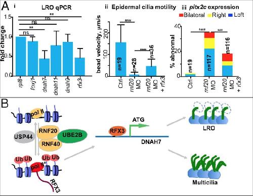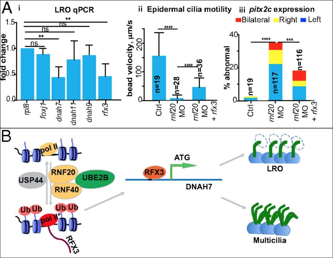 Figure 5. Transcription factor Rfx3 is downstream of Rnf20. (A, i) Quantitative RT-PCR of cilia-related genes in the Xenopus LRO: foxj1, dnah7, dnah9, dnah11, and rfx3. Levels of expression are normalized to rpl8 (ribosomal protein 8). Data are shown as mean ± SEM (n = 3). Unpaired t test, **P < 0.00. (A, ii) Quantification of epidermal fluid flow across the Xenopus multiciliated epithelium in Ctrl, rnf20 MO, and rnf20 MO + Rfx3 mRNA coinjection at the one-cell stage. Mean ± SEM (n = 3). n, number of embryos. ****P < 0.00005 (Left). (A, iii) Percentage of embryos with abnormal pitx2c after either Ctrl, rnf20 MO, or rnf20 MO + Rfx3 mRNA coinjection at the one-cell stage. Mean ± SEM (n = 3). n, number of embryos. ***P < 0.0005, ****P < 0.00005 (Right). (B) Proposed mechanism of RNF20 control of cilia motility. E3 ligase RNF20 together with other members of the H2B120K ubiquitination complex selectively ubiquitinates H2B120K at the RFX3 locus, transcriptionally activating RFX3. RFX3, known master regulator of ciliary genes, then drives expression of DNAH7, a motor protein component of the ciliary IDAs required for cilia motility.